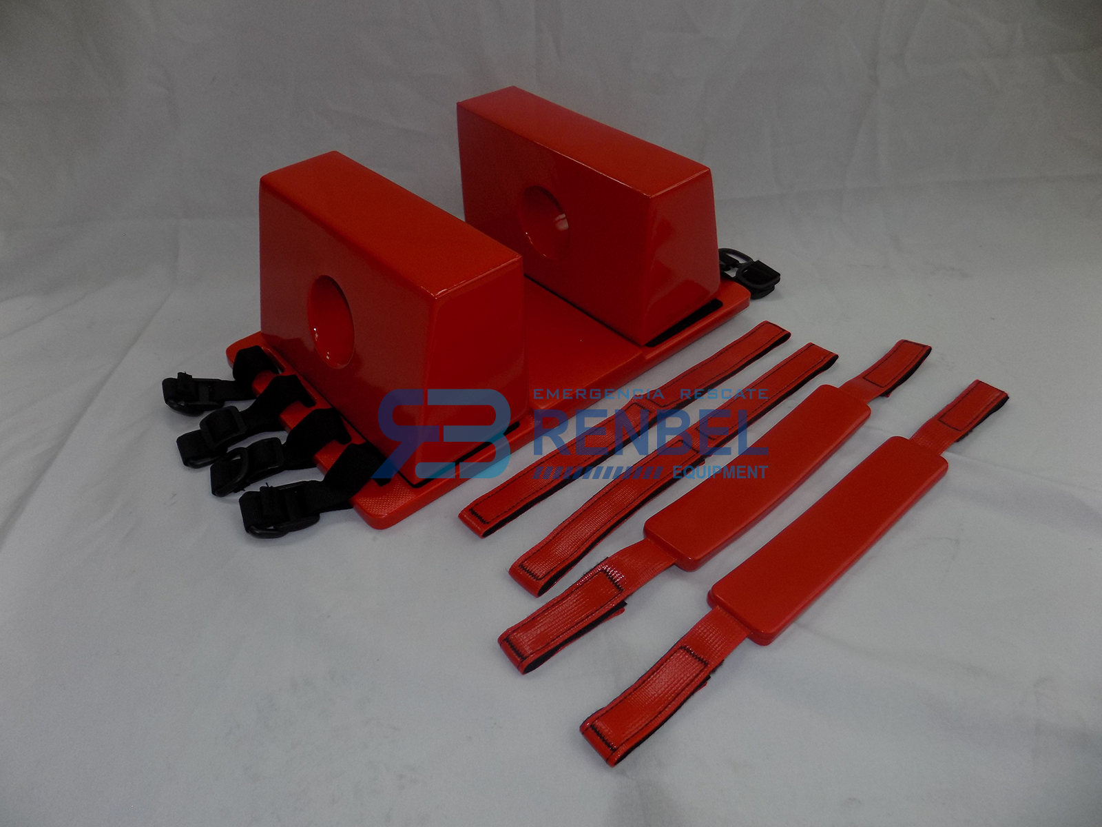 Posee correas regulables de fijación en todo tipo de tablas y camillas de politraumatismo, producto de servicio pesado continuo, con correas para frente y mentón. Traslúcido a RX, CT y MRI